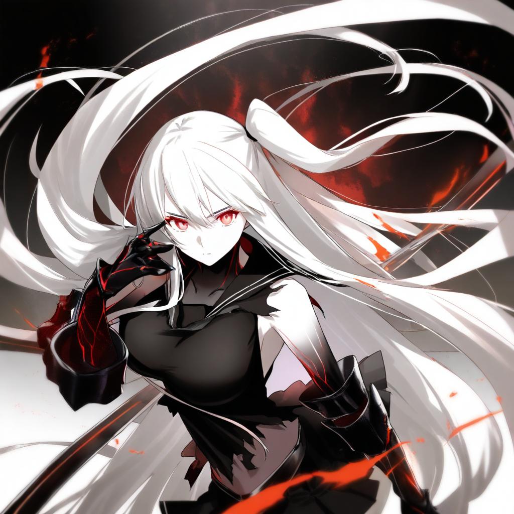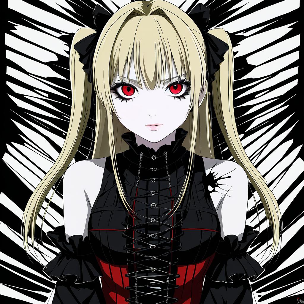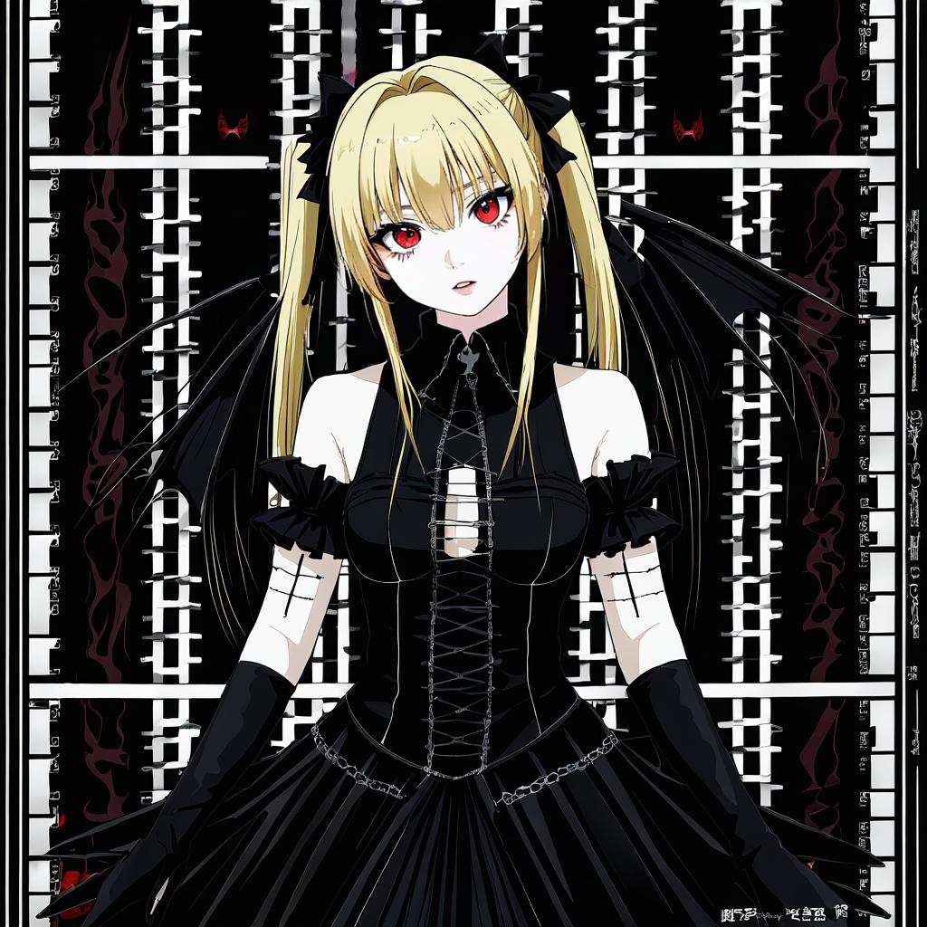 Amane misa, death note, 1girl, red eyes, blonde hair, long hair, two side up, medium breasts, black dress, bare shoulders, detached sleeves, nail polish, goth fashion, goth fashion, by artist sasucchi95, anime