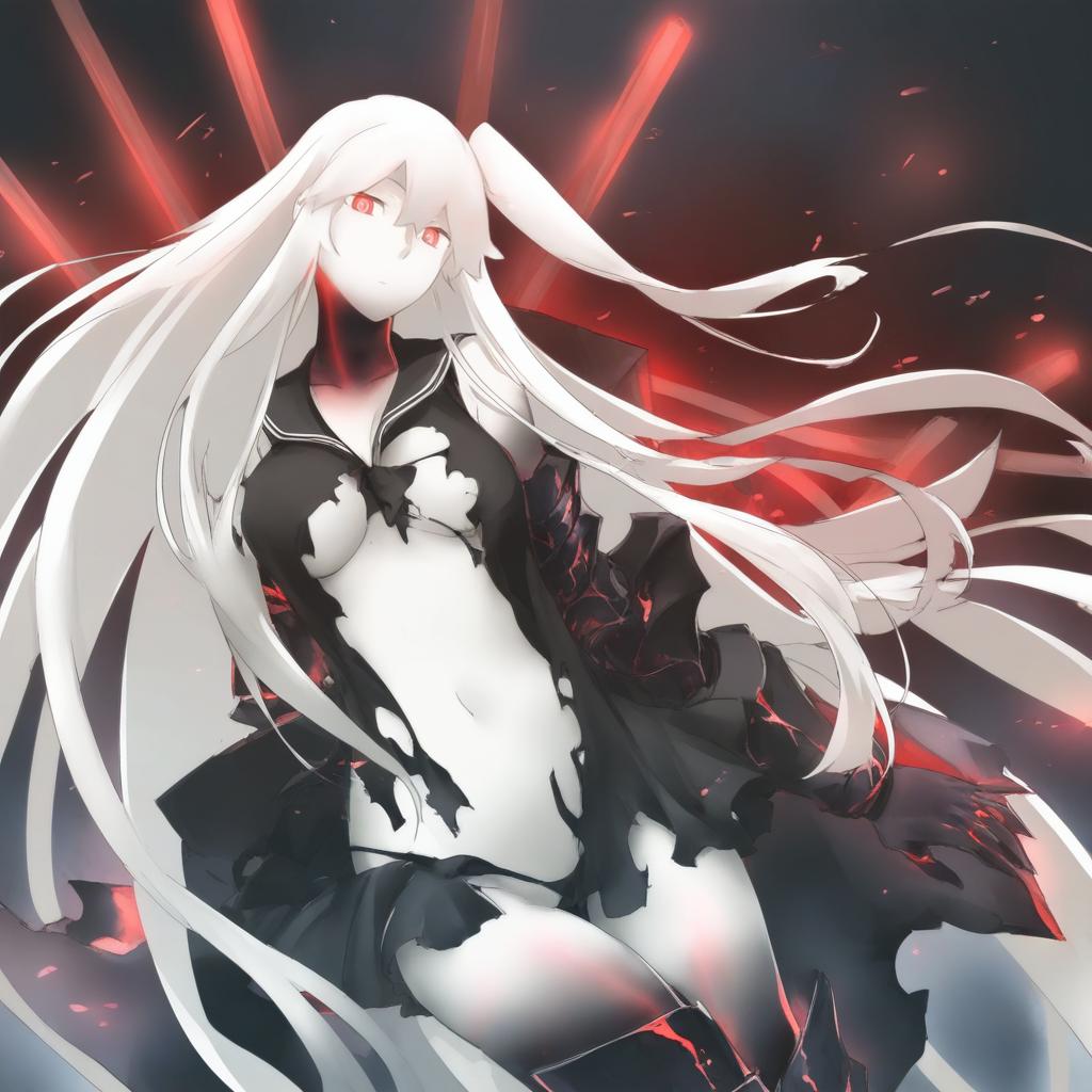 Anime-style illustration of a goth girl with long blonde hair styled in two side ponytails, striking red eyes, and medium bust. She wears a detailed black gothic dress with bare shoulders and detached sleeves. The background features a dark patterned design with stylized floating skulls and faces, enhancing the eerie and gothic atmosphere.