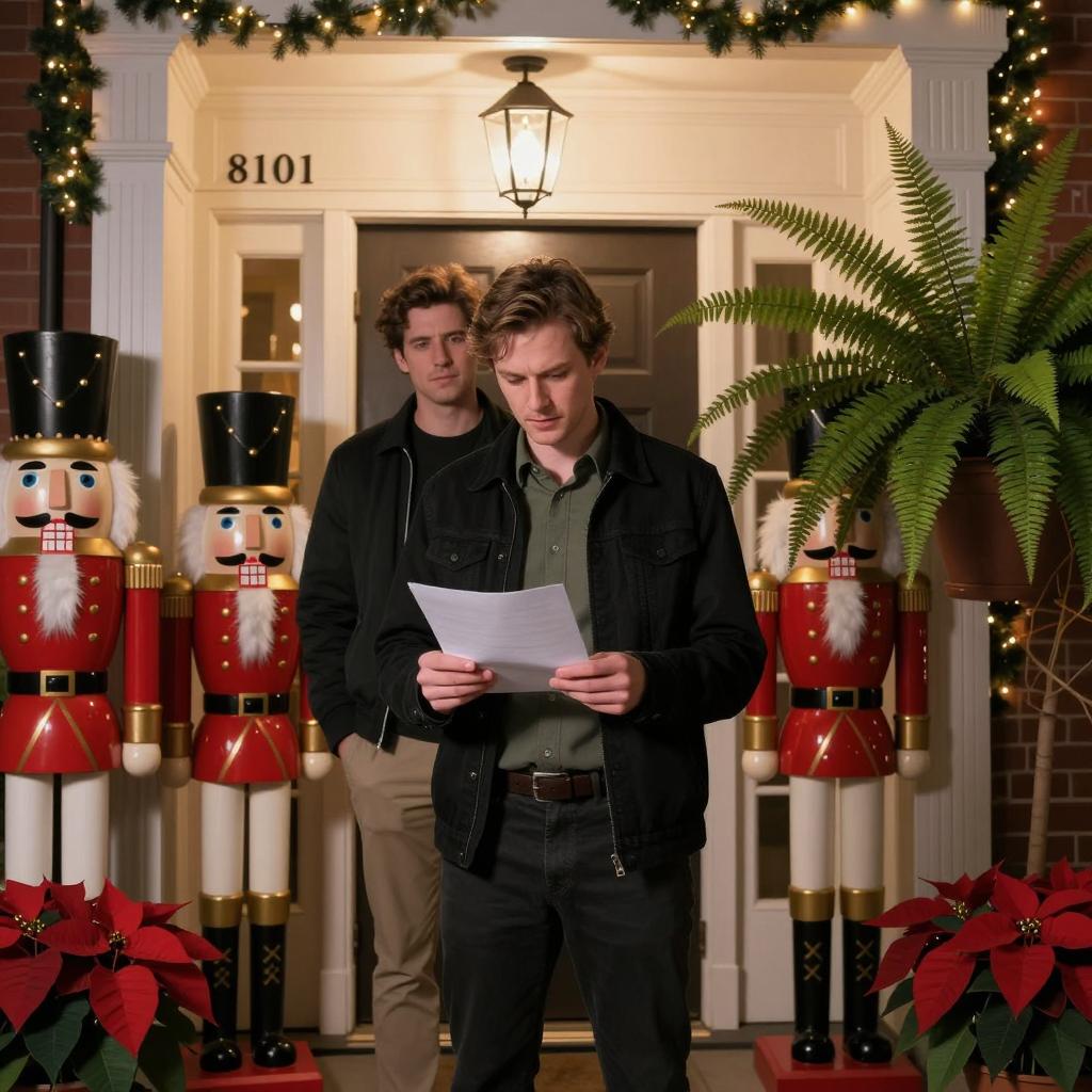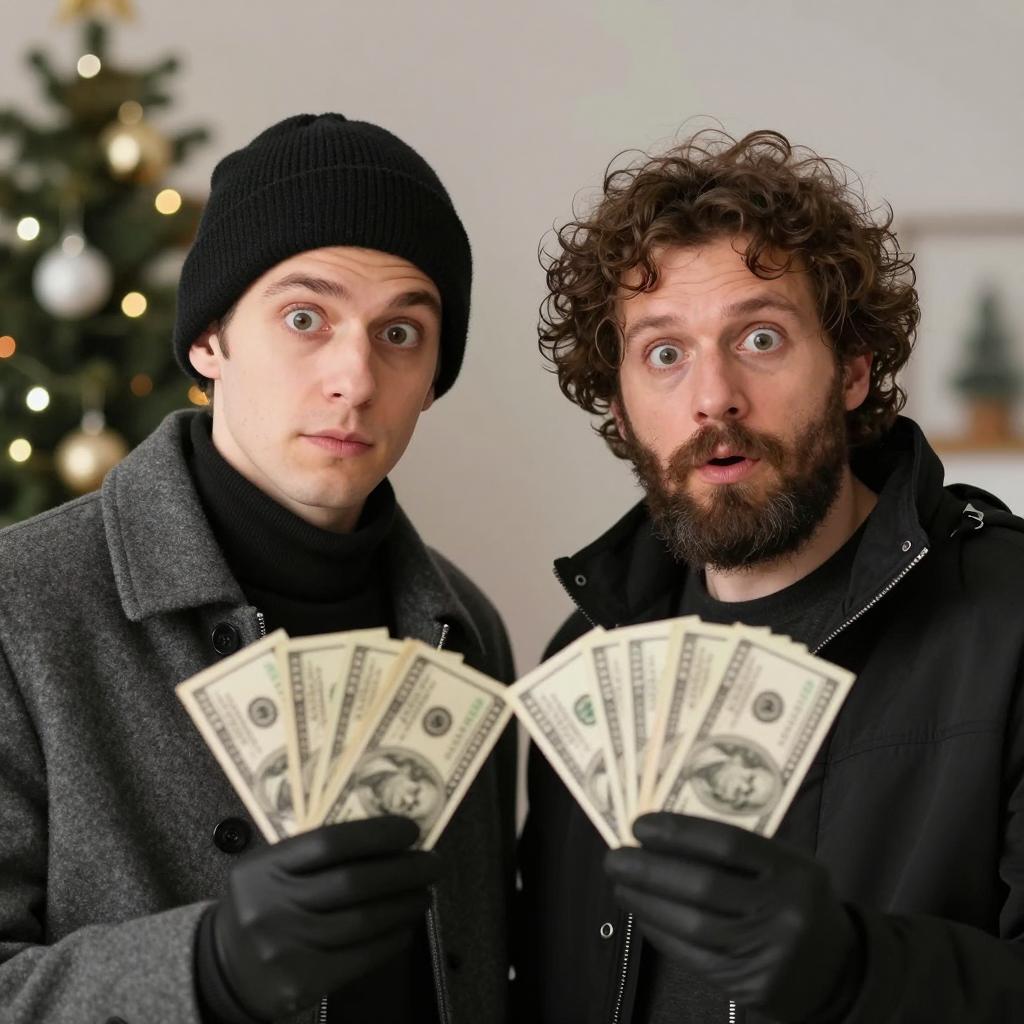Two men in a festive, blurred background. The man on the left wears a black beanie and gray coat, with wide eyes. The man on the right has curly brown hair, a beard, and wears a black jacket with a surprised expression. Both hold stacks of money in gloved hands.