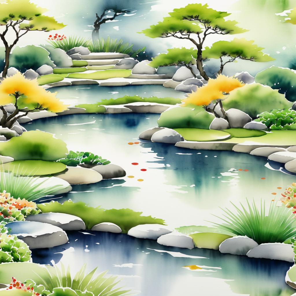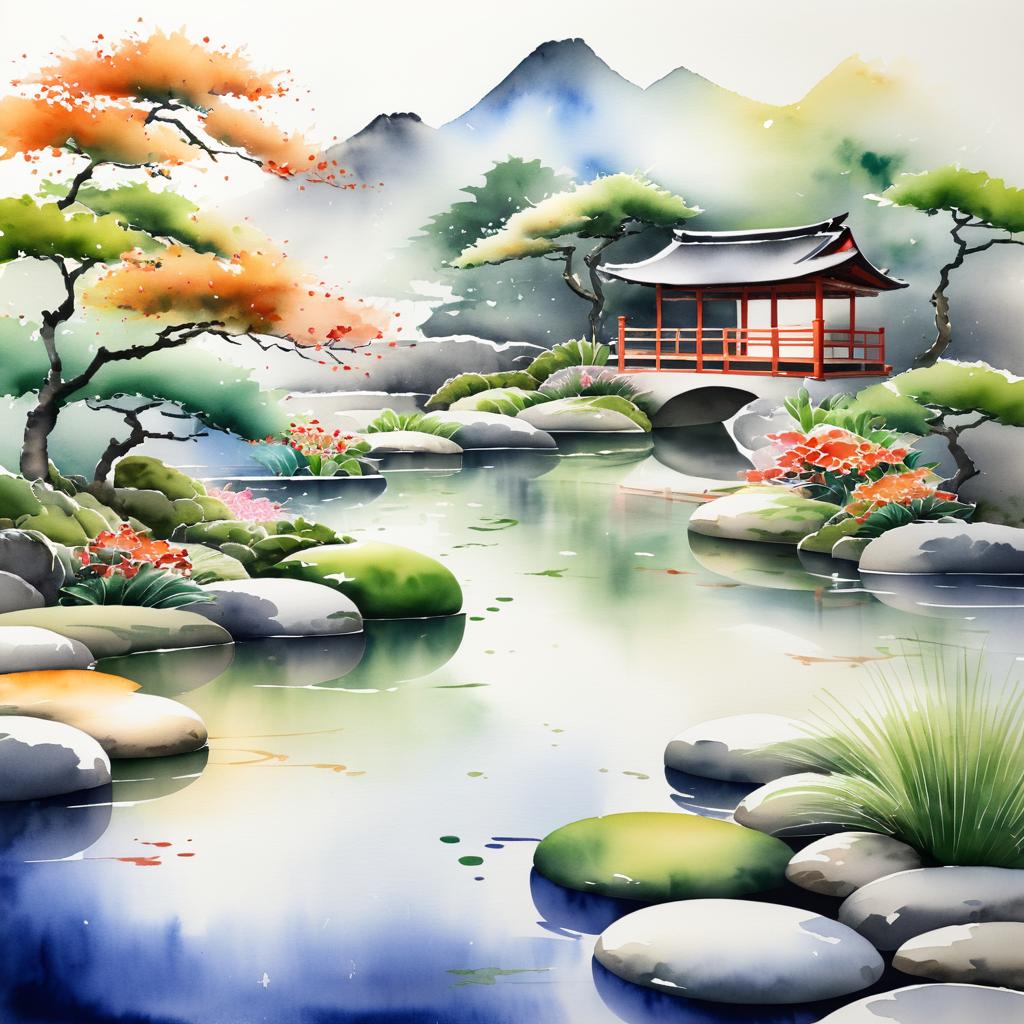 Zen garden created in traditional Japanese watercolor, capturing cultural elegance.