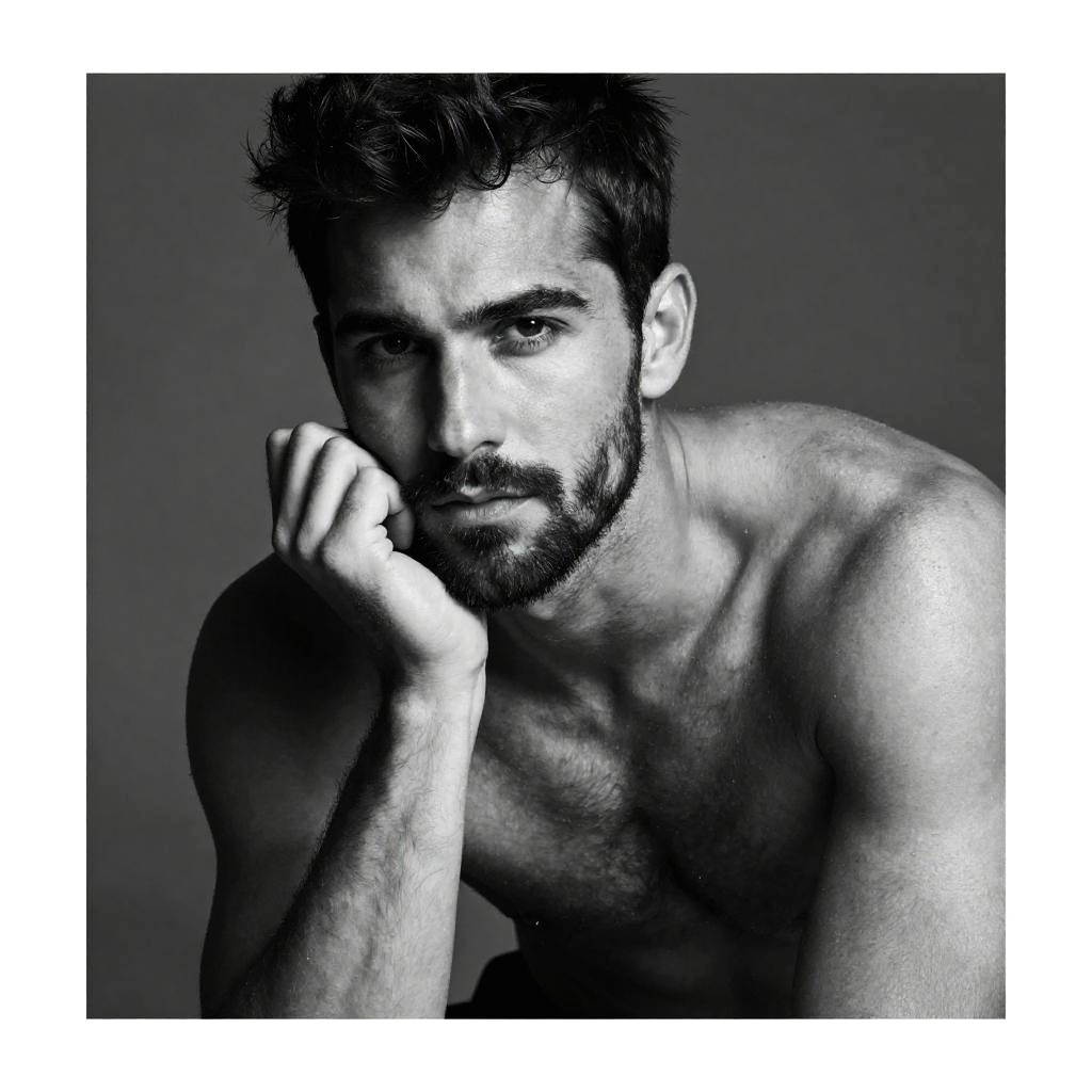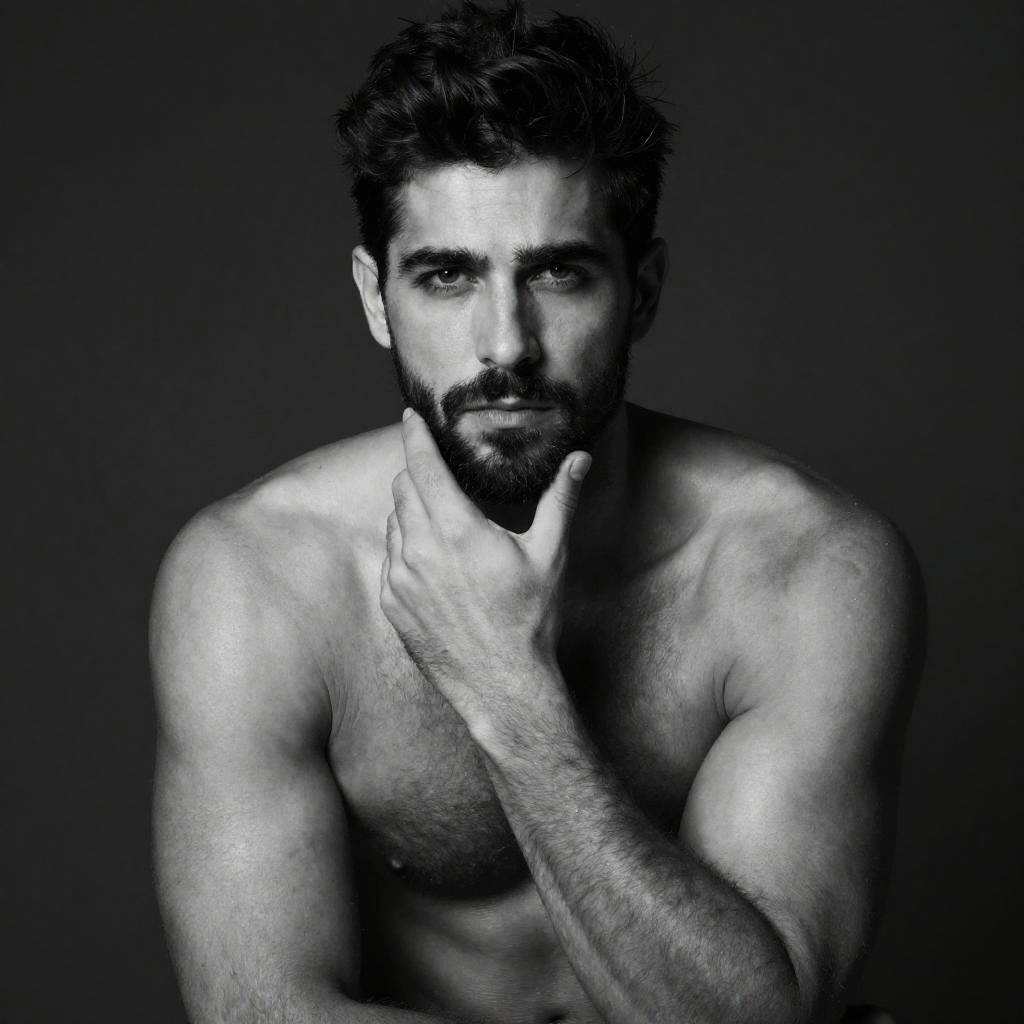 This is a black-and-white photograph of a shirtless, attractive man with dark hair and a trimmed beard. He gazes intensely at the camera with one hand resting on his chin. The lighting creates soft shadows that emphasize his strong jawline and muscular build. The background is dark, making the subject stand out. The image has a high contrast, giving it a dramatic feel.