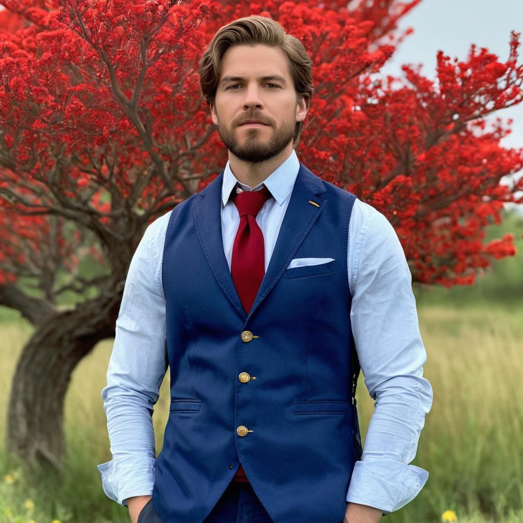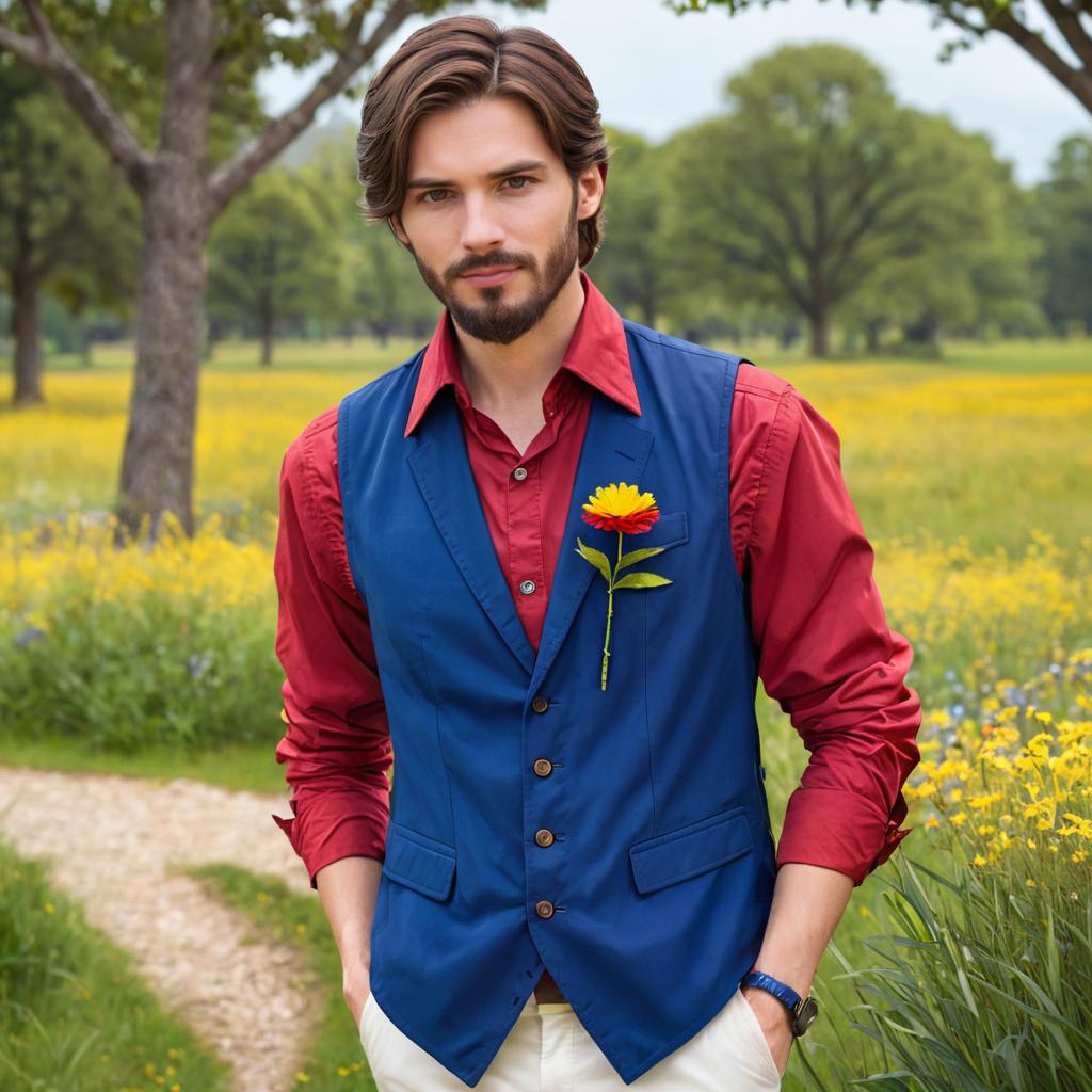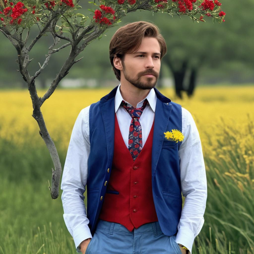 1boy, male focus, flower, necktie, solo, facial hair, jacket, vest, brown hair, tree, outdoors, shirt, hands in pockets, beard, red jacket, looking at viewer, red necktie, collared shirt, blue vest, grass, white shirt, yellow flower, pants, red flower, long sleeves