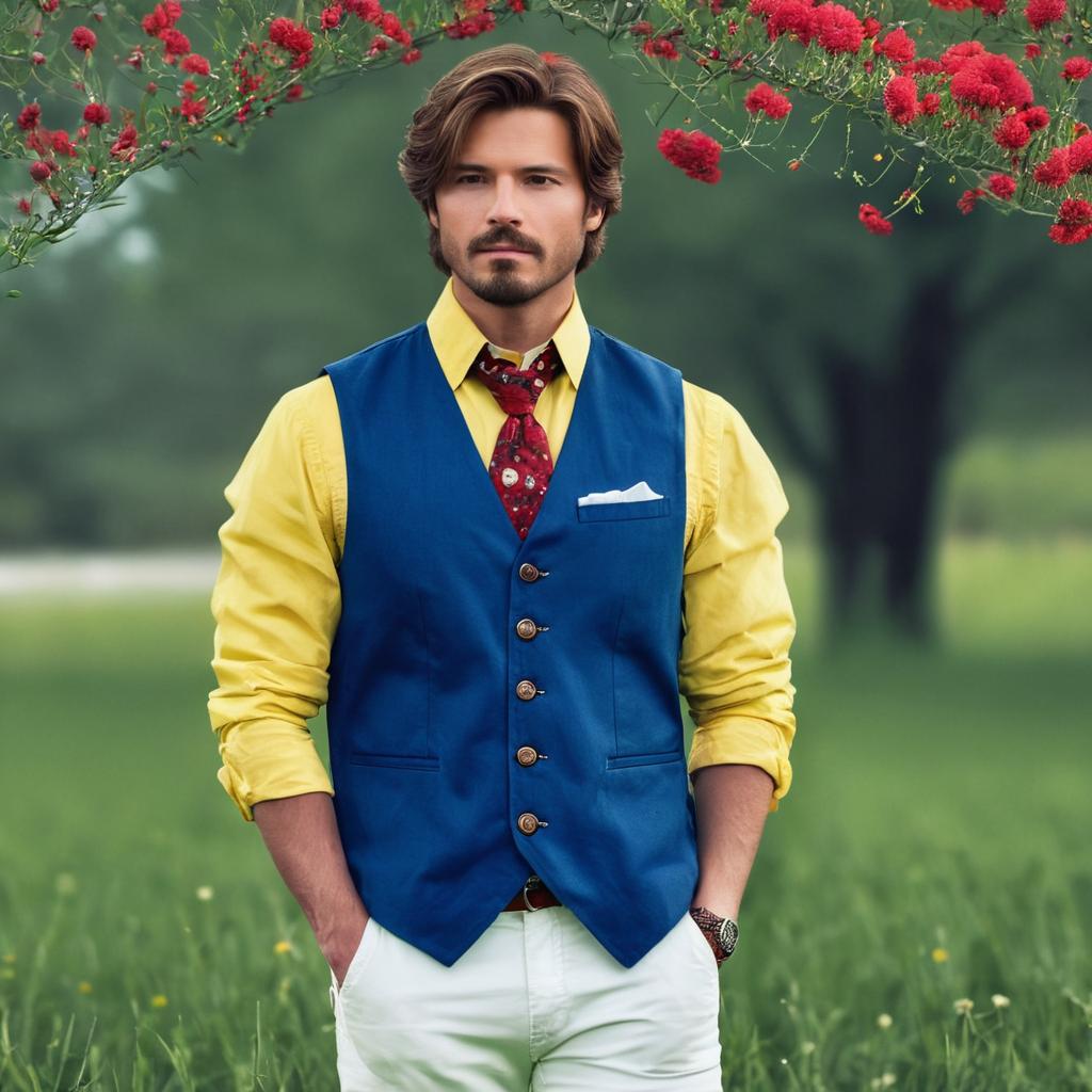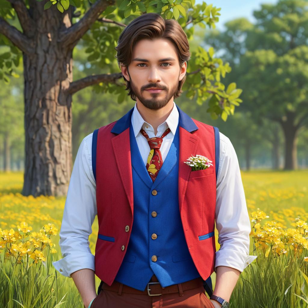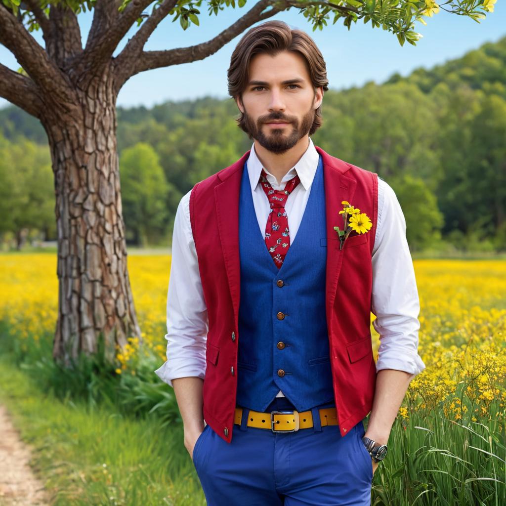 A young bearded man wearing a red vest over a blue shirt and light-colored pants stands outdoors beside a tree with yellow blossoms. The background features a lush green meadow and forest under bright daylight.