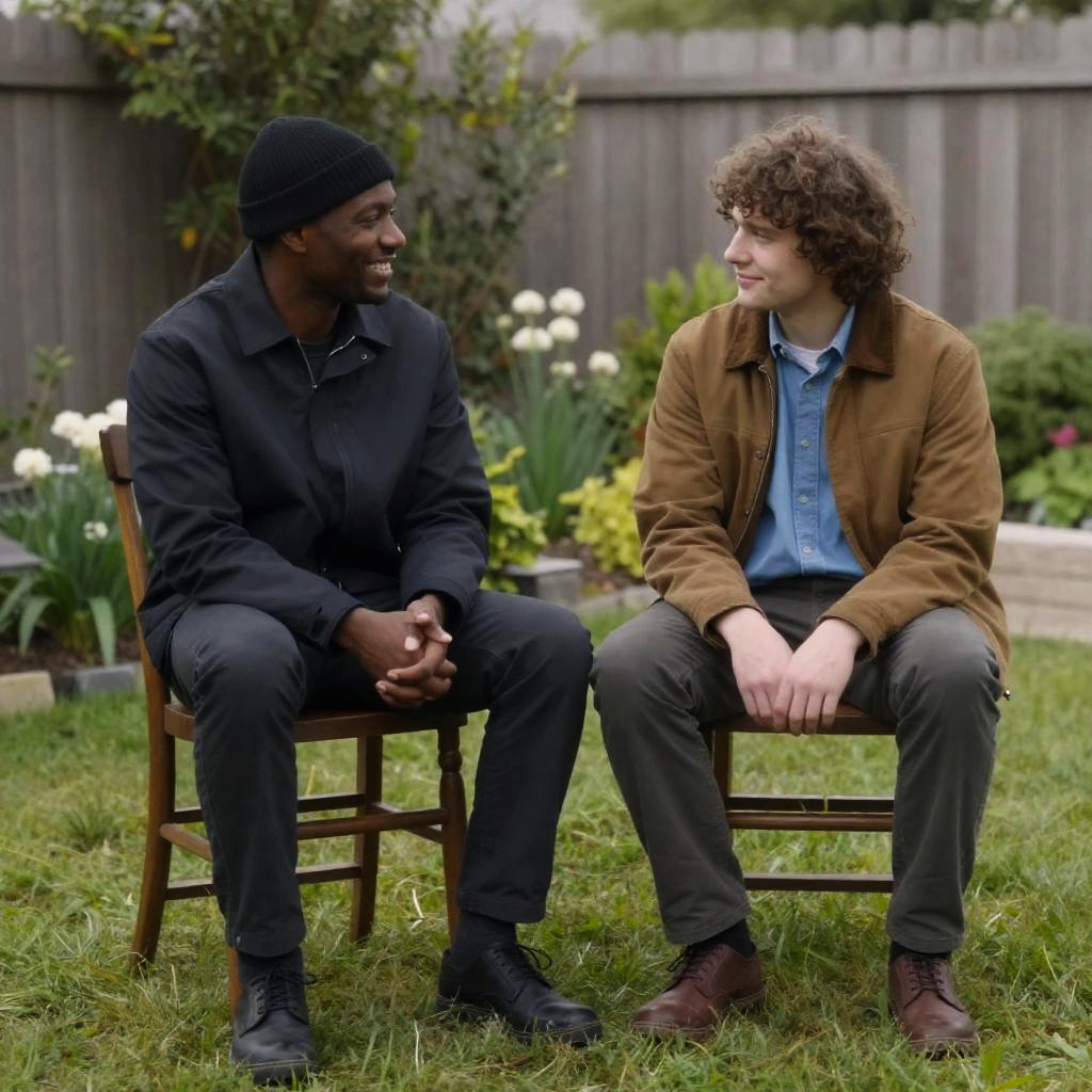 Photograph of a Caucasian woman and a Black man sitting on a tree log. Woman has short brown hair, light beige coat, navy shirt, blue jeans, looking at man with slight smile. Man has shaved head, dark green polo, blue jeans, looking at woman with relaxed expression. Brick building in background. Both seated, hands on knees, legs crossed. Daylight, outdoors.