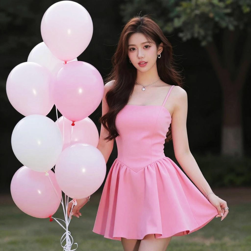 Photograph of an Asian woman with long black hair, wearing a bright pink, sleeveless, strapless, and flared dress that accentuates her slim figure. She stands against a plain gray background, holding a cluster of pink and white balloons behind her. She wears a silver choker necklace and has a neutral expression on her face. The dress has a slightly textured, soft fabric and the balloons are tied with thin strings. The image has a soft, studio lighting that highlights her smooth skin and the vibrant color of her dress.