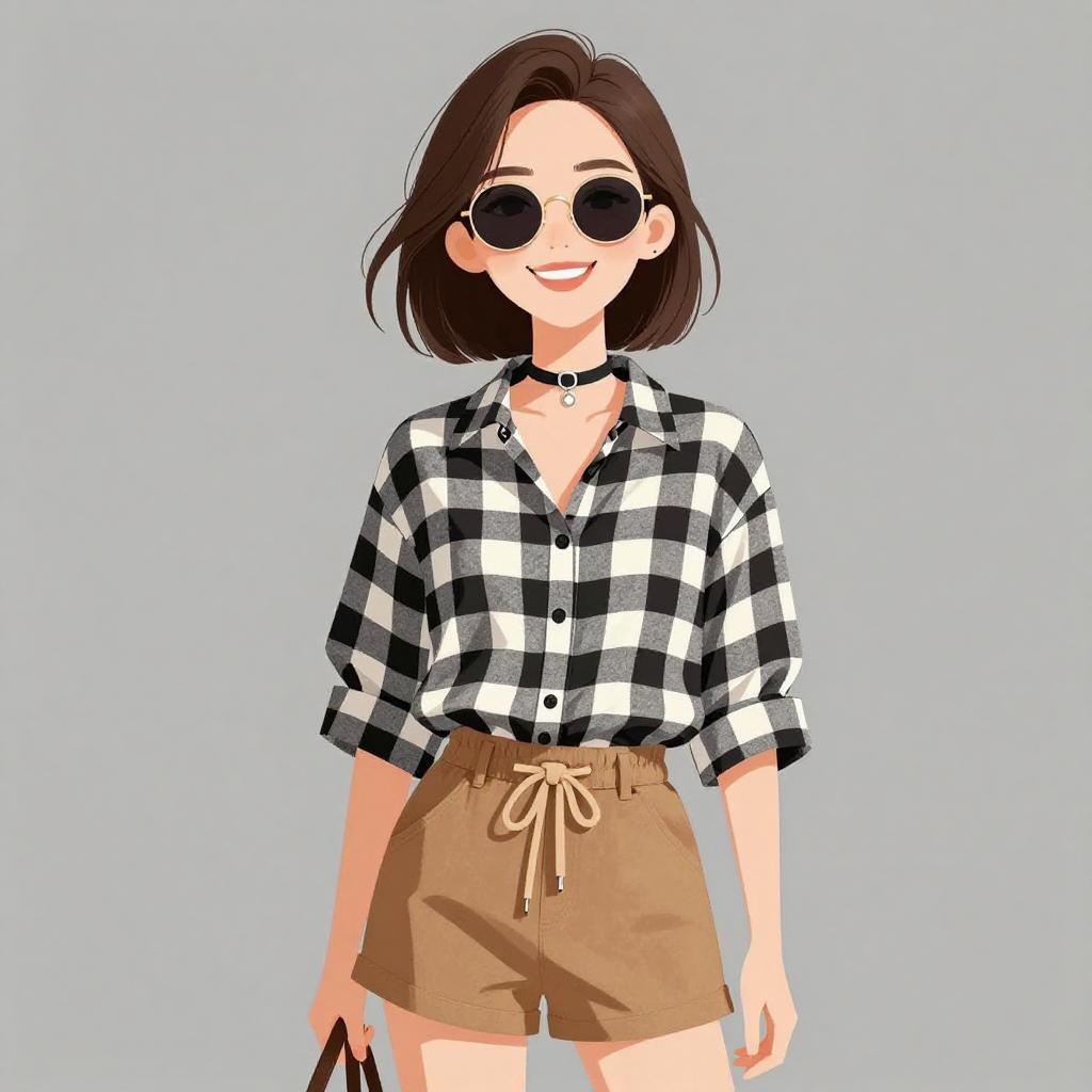 Woman with pretty face and pretty hair. smiling Woman, casual, black and white gingham check shirt, loose fit, rolled-up sleeves, tan suede shorts with drawstring waist and fringe detail, black choker necklace with silver charm, dark round sunglasses. --sref 1467