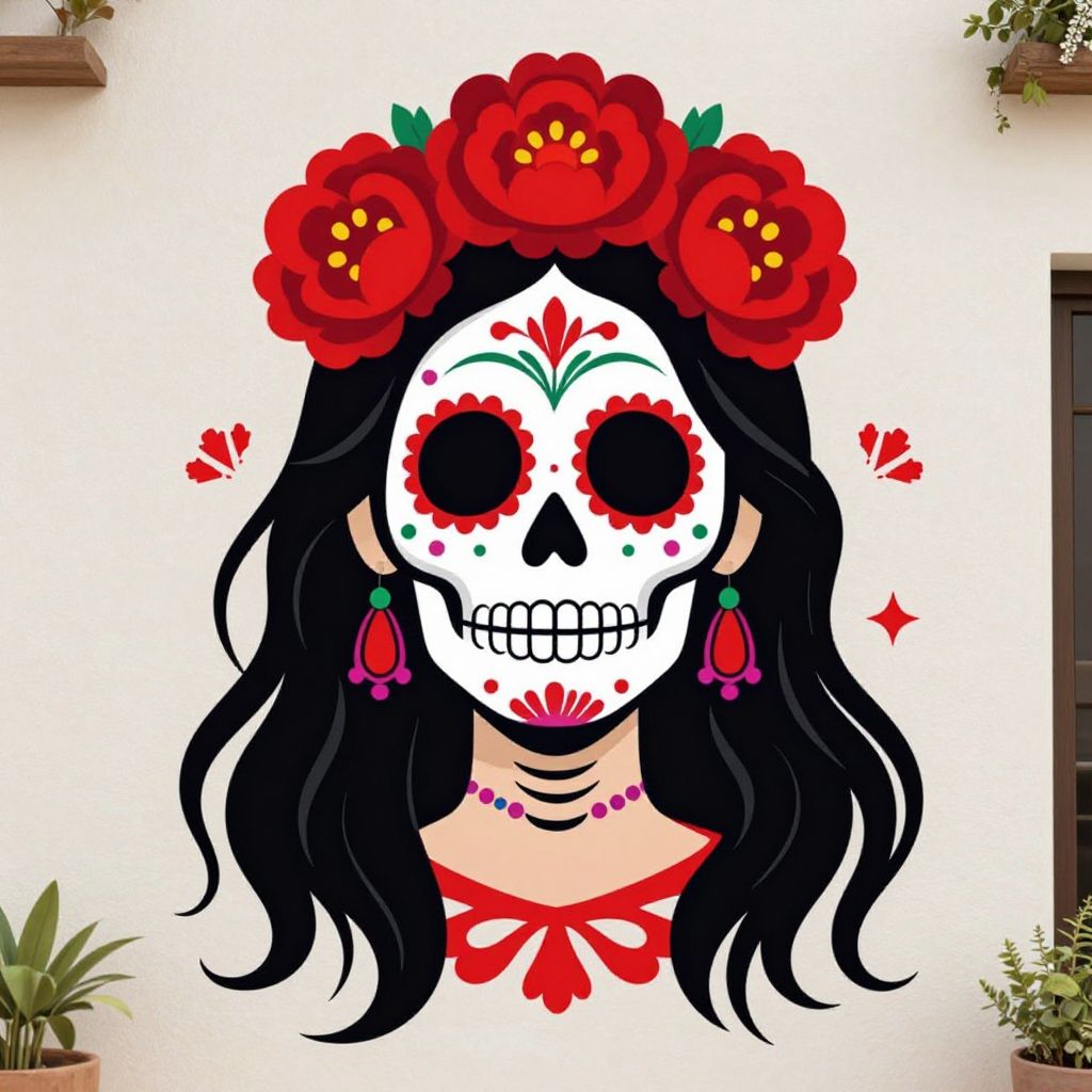 A vibrant Dia de los Muertos sugar skull woman graphic decal featuring intricate red floral accents in her hair, rendered in bold, high-definition digital art with a striking contrast between the detailed sugar skull makeup and flowing black hair, showcasing a vivid blend of traditional Mexican folk art and modern graphic design.