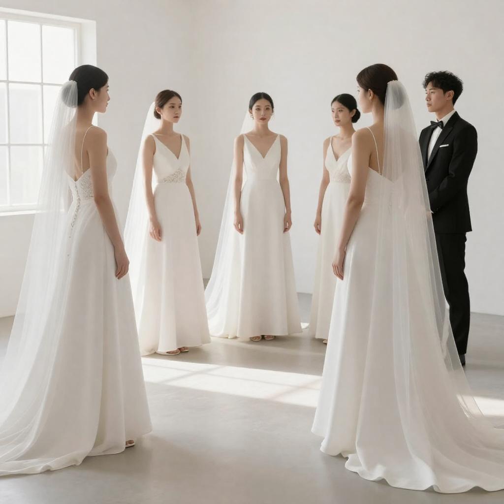 Photograph of five women in white wedding dresses with long veils standing in a well-lit room. One man in a black tuxedo stands to the right. The women are positioned in a semi-circle, facing different directions. The background includes a white wall and a window with sunlight streaming in.