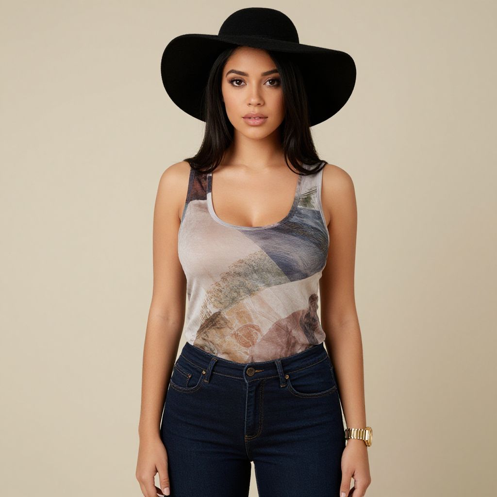 "Woman, bohemian, sleeveless top with vibrant mix of geometric and abstract patterns in yellow, orange, red, and blue, scoop neckline, relaxed fit, denim jeans in a dark wash, slim fit, low-rise, subtle whiskering, brass cuff bracelet on one wrist.. Sexy. Pretty face and beаutiful eyes. Big breasts."
