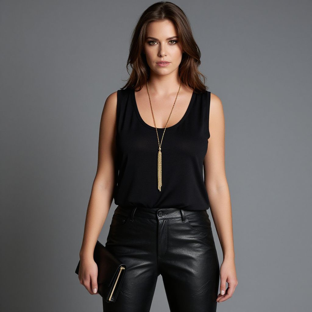 Photograph of a woman with long dark hair, wearing a colorful, patterned sleeveless top and dark jeans, with a gold bracelet, standing against