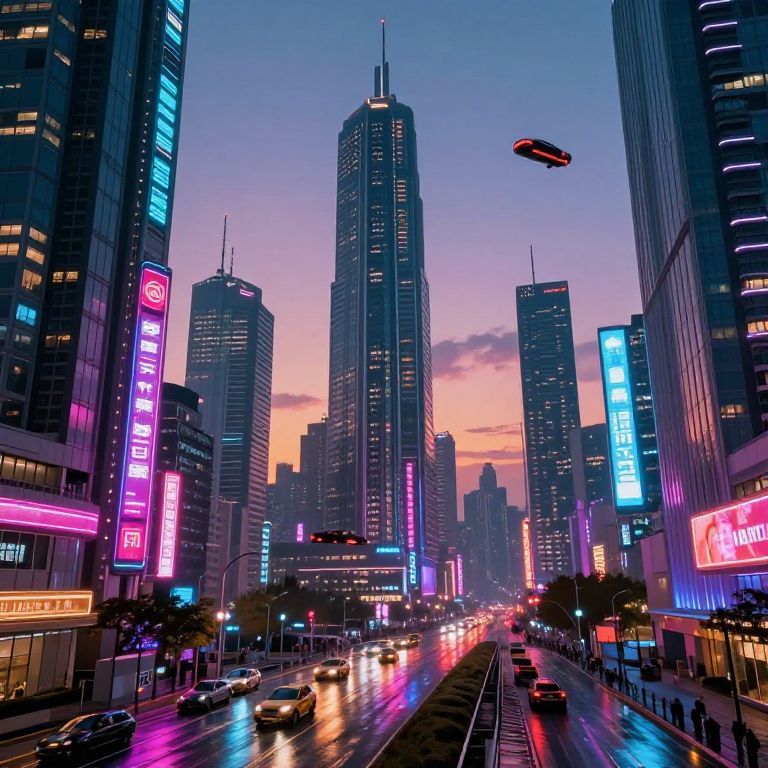 Revaling futuristic cityscape at twilight, glowing neon signs reflecting on wet streets, sleek skyscrapers with flying cars, cyberpunk vibe, highly detailed and vibrant colors