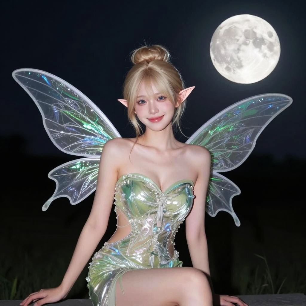 An ethereal young woman with blonde hair styled in a bun, blue eyes, and pointed elf-like ears poses outdoors at night. She wears a strapless, iridescent green dress that accentuates her bare shoulders and cleavage. Transparent fairy wings with shimmering details extend behind her, illuminated by the full moon in the dark sky.