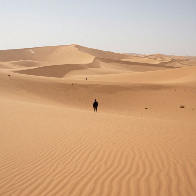 Photograph of a lone person standing in vast, rippled, golden desert sand dunes under a clear, bright sky. Silhouetted figure