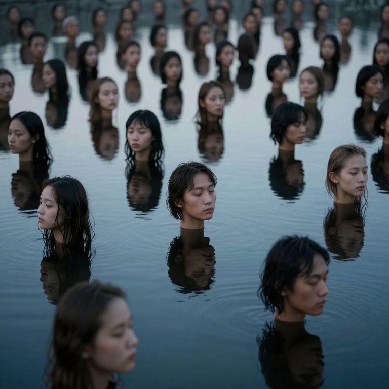 Photograph of numerous East Asian women with wet, black hair, floating in a serene, reflective body of water. Their heads are above water, facing various directions, creating a repetitive, almost hypnotic pattern. The women have calm, neutral expressions, and the water's surface is smooth with subtle ripples. The background is blurred, focusing attention on the women's faces. The image uses cool, blue-toned lighting, adding to the tranquil, surreal atmosphere. The overall composition emphasizes unity and repetition, with the women's faces forming a grid-like structure in the water.