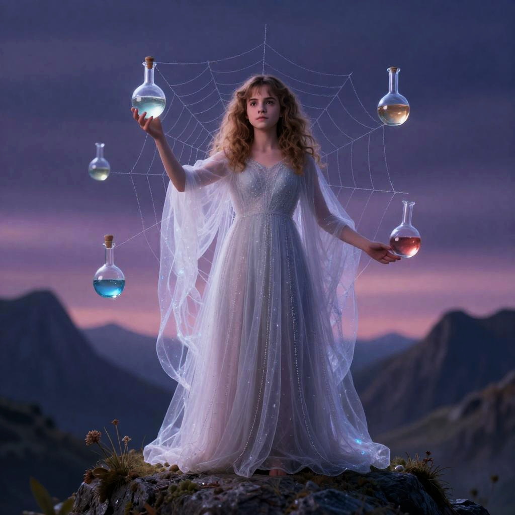 Realistic photo.A whimsical, dream-like Hermione Granger depicted as a celestial figure, with iridescent cosmic spikes, surrounded by blazing solar flares, standing in a ever-changing astral ocean. realistic photo