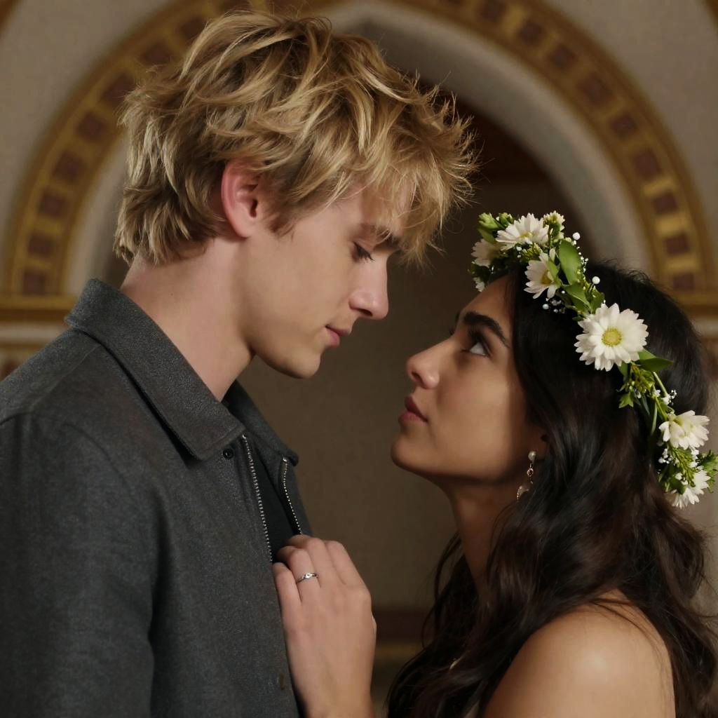 Photograph of two shirtless people with intense facial expressions. Blonde man with wavy hair, muscular build, wearing a bracelet, gazes down. Dark-haired woman with curly hair, leans in, touching his shoulder. Blue patterned background, close-up shot.