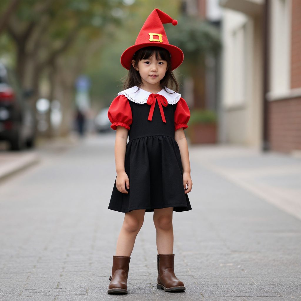 Munchkin Costume, little girl wearing a hat and boots on the street