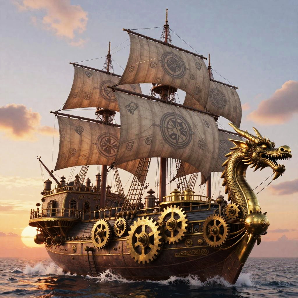 Fantasy airship concept art featuring a massive ship with dragon-shaped figurehead, brass gears and steam vents, vibrant sunset sky, detailed rigging and sails with enchanted symbols