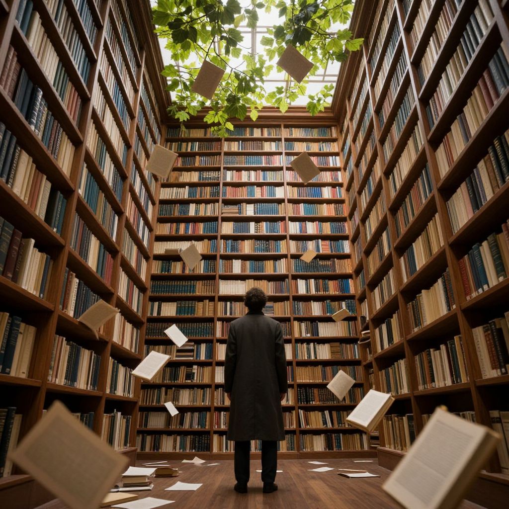Books float through the air in a surreal library, where a man in a long coat stands amidst falling pages, surrounded by towering shelves filled with countless volumes under a canopy of green leaves above.