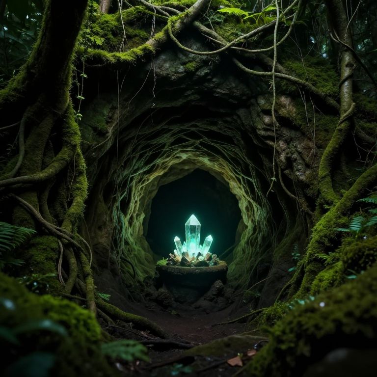 An ancient sinkhole in a jungle, partially covered by vines and moss, revealing a hidden entrance to an underground cave illuminated by glowing crystals, fantasy atmosphere, mystical and mysterious, richly textured, immersive environment