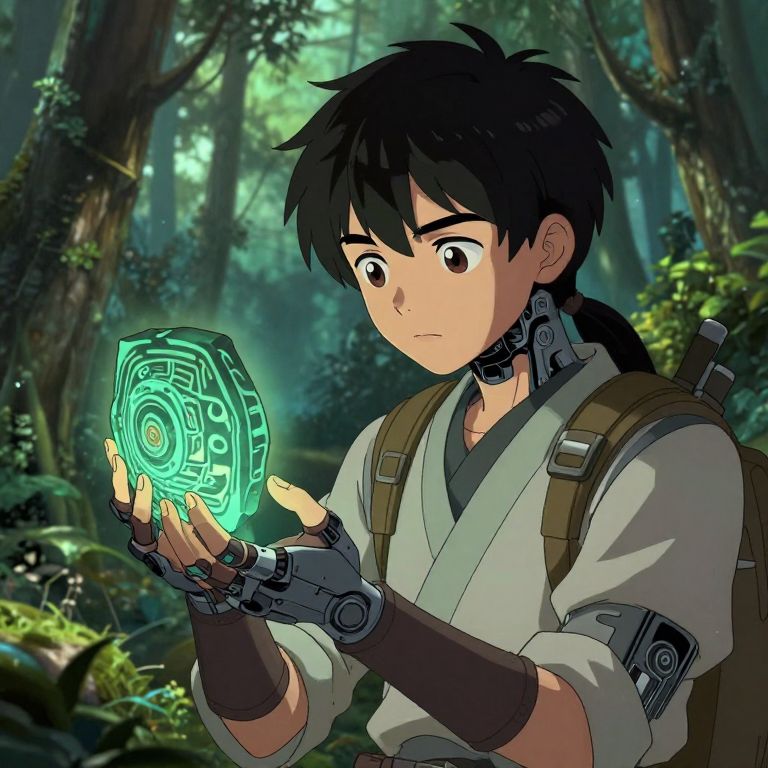 AIWebtoon scene featuring a young protagonist discovering an ancient AI artifact, lush forest background, mix of traditional fantasy and cybernetic elements, expressive facial details, intricate linework, immersive storytelling atmosphere, digital painting style.