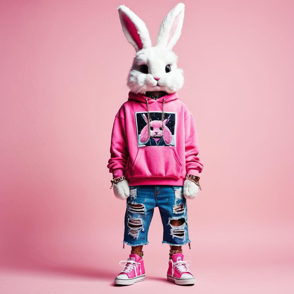 A surreal anthropomorphic pink rabbit character wearing a shiny pink hoodie, ripped denim shorts with keychains, and matching pink sneakers. The rabbit is adorned with extravagant gold chains, bracelets, and features a large, fluffy tail in pink and blue hues. The character stands confidently against a vibrant pink background, exuding a playful and whimsical streetwear style.