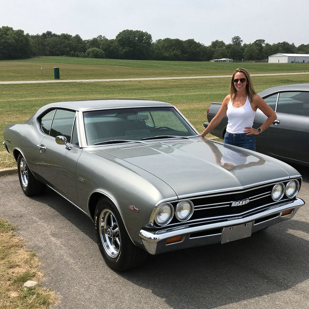 Photograph of a silver 1960s muscle car with chrome details, parked on a sunny grassy field; a woman in sunglasses and white tank