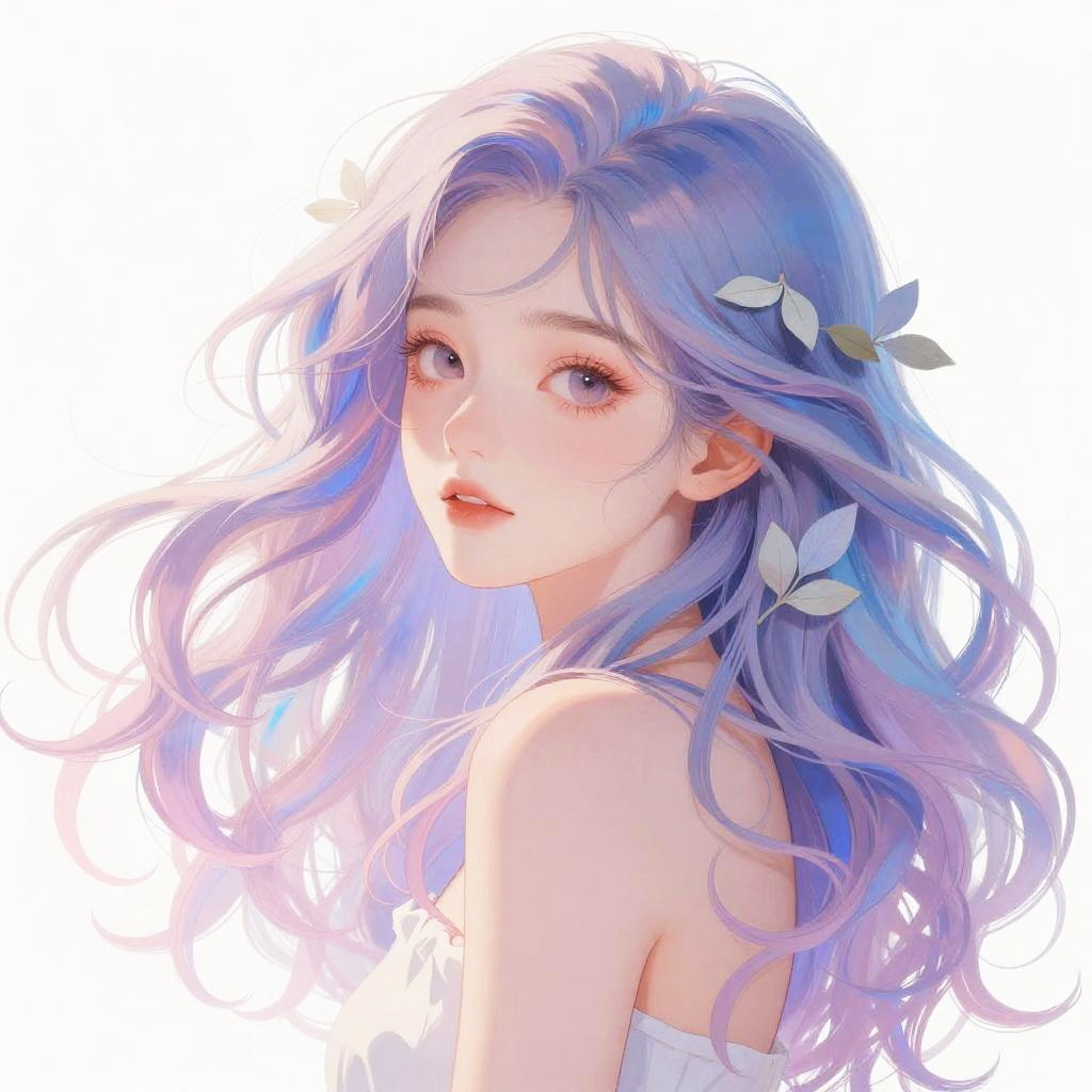 This vibrant illustration features a young woman with flowing, pastel-colored hair adorned with delicate leaves. The ethereal style and soft color palette create a dreamlike atmosphere, highlighting the beauty and serenity of the subject.