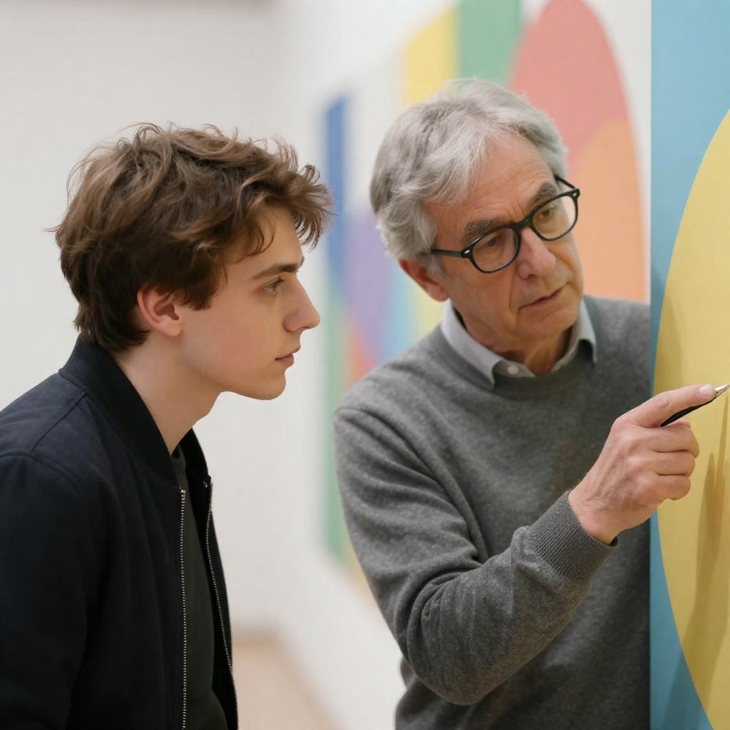 Photograph of two men. Young man with short brown hair, black jacket, leaning forward, looking intently. Older man with gray hair, glasses, gray sweater, holding a pen, pointing at a colorful abstract background. Bright, colorful light patterns behind older man. Both focused on interaction.