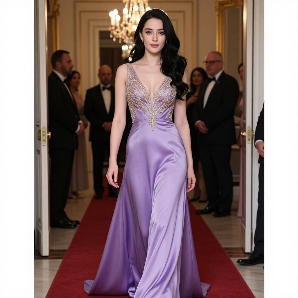 Photograph of a beautiful woman with long, wavy black hair walking down a luxurious hall. She's wearing a stunning, floor-length, lavender satin gown with a deep V-neck and intricate gold embroidery on the bodice. The background shows elegant chandeliers, a red carpet, and elegantly dressed men and women in formal attire. The setting has an opulent, classical style.