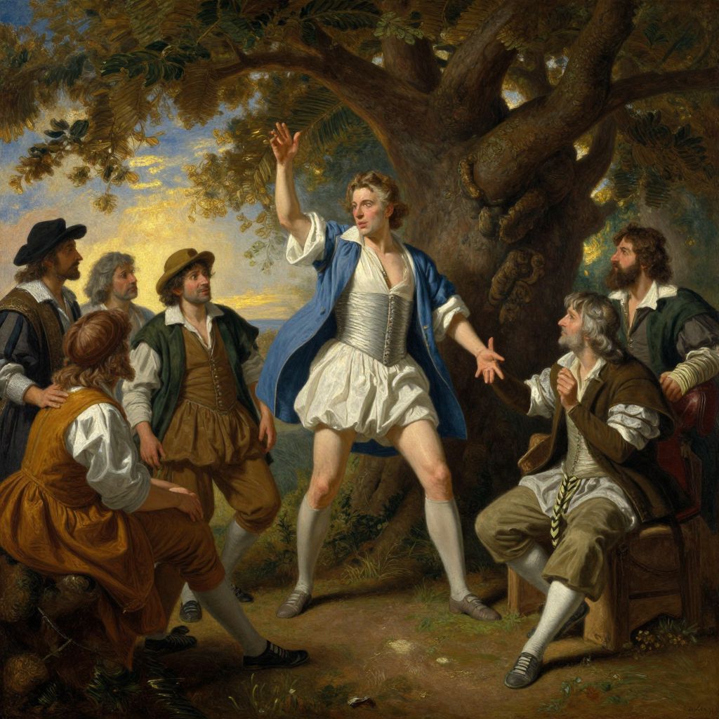 Candide depicted in a dramatic scene of philosophical debate under an ancient tree, surrounded by scholars in period costumes, illuminated by golden hour light, rich textures on clothing and nature, oil painting style with dynamic shadows and highlights