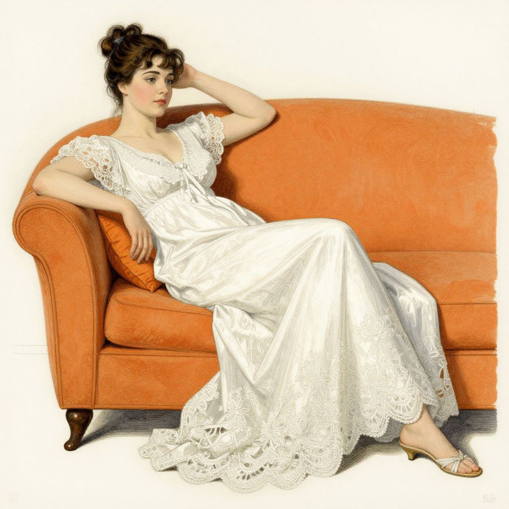 A vintage-style illustration reminiscent of Paul Chabas' work, featuring a woman in a delicate white gown lounging on an orange couch, rendered with soft lighting and classic compositional techniques.