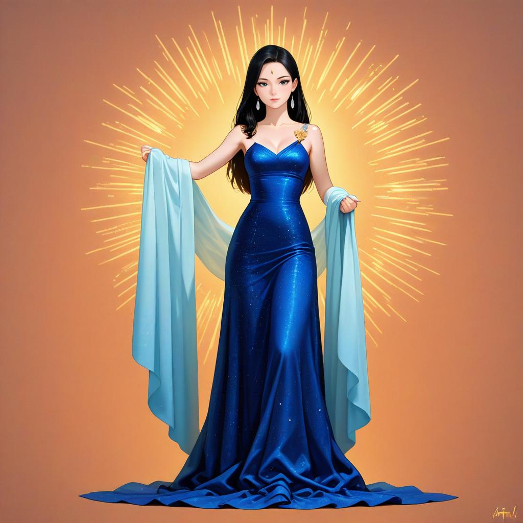 A digitally illustrated elegant woman wearing a shimmering deep blue evening gown with thigh-high slits, holding a flowing translucent white veil. She has long black hair, a jeweled necklace, and matching earrings. The background features a scenic sunset with warm orange and purple tones, framed by decorative columns on either side.