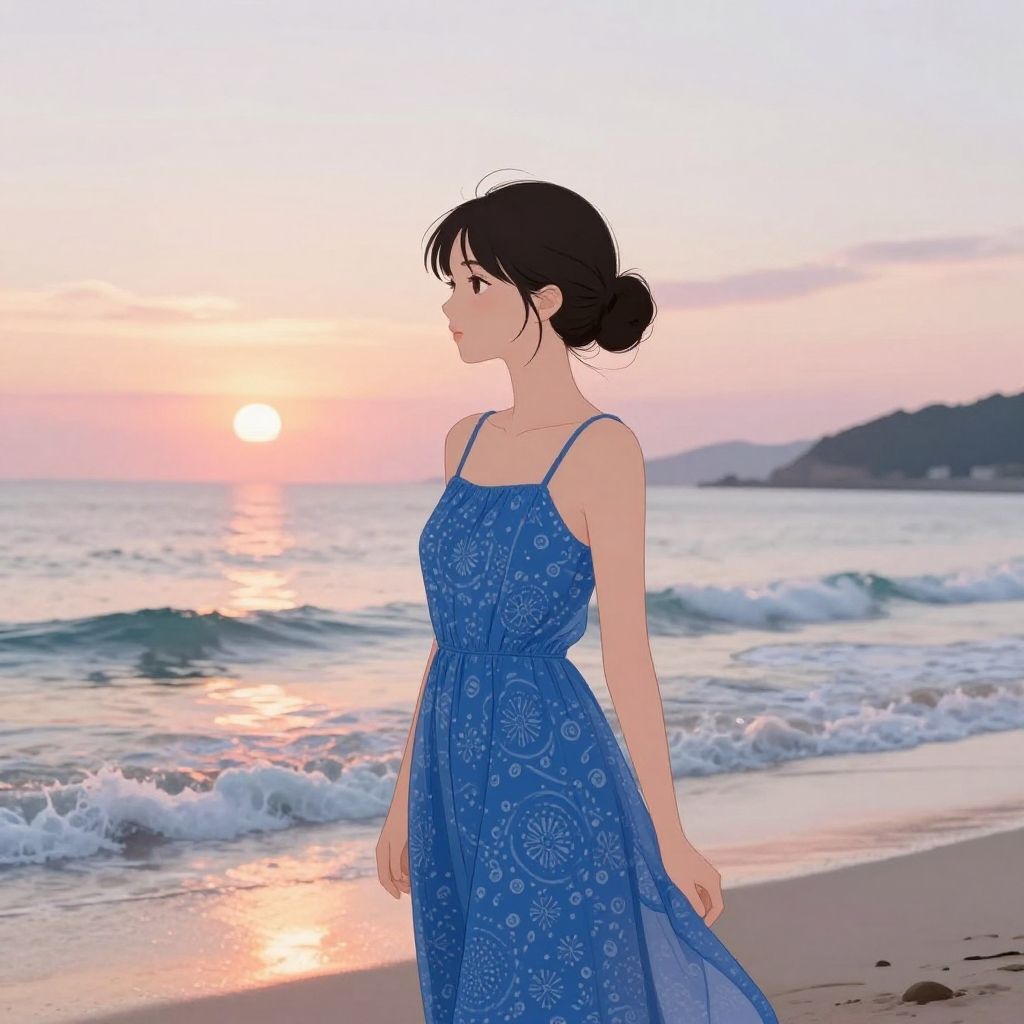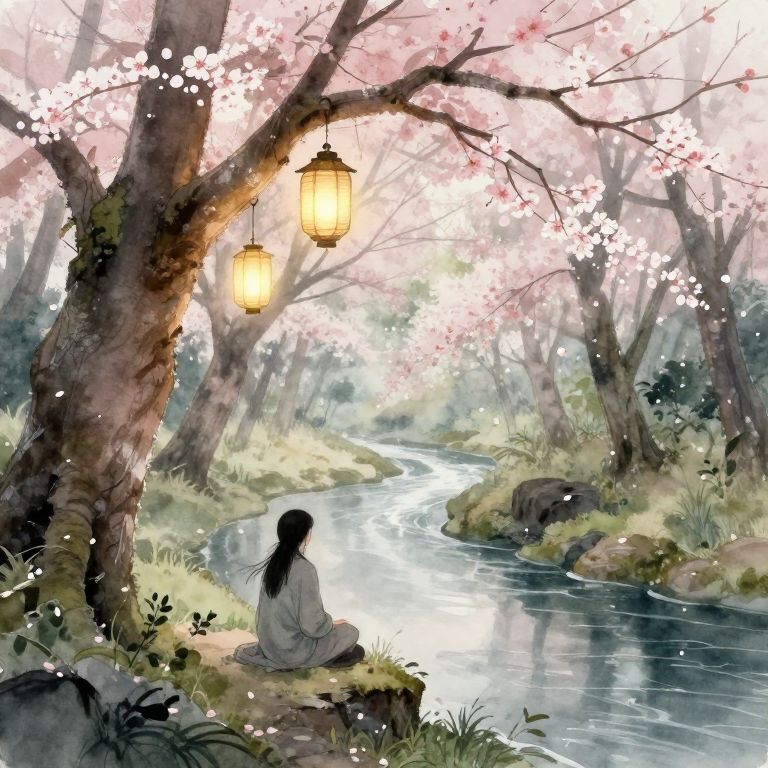 Soft watercolor painting of a kobieta sitting by a calm lake during autumn, colorful fallen leaves floating on water, gentle pastel colors, peaceful and contemplative mood, delicate reflections and subtle details in the landscape
