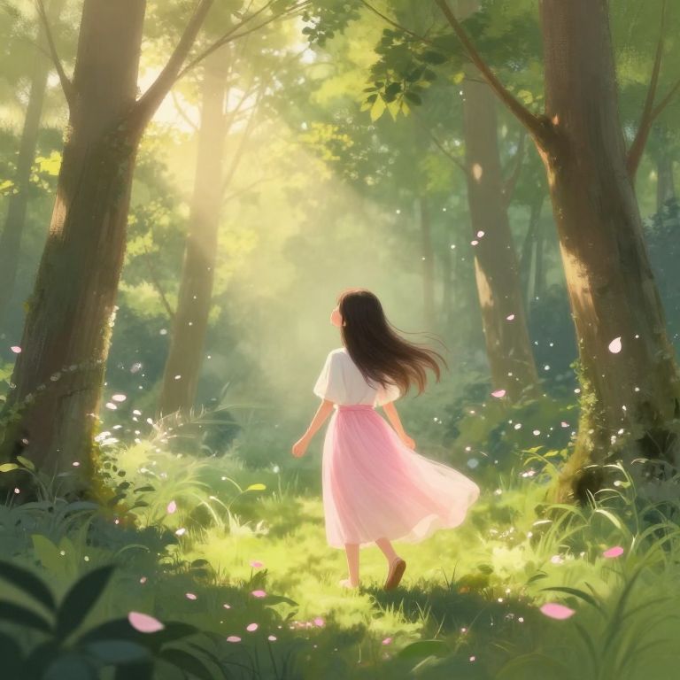 Digital painting of a woman with long brown hair in a white sweater and white skirt, sitting by a reflective lake, surrounded by autumn leaves and vibrant foliage