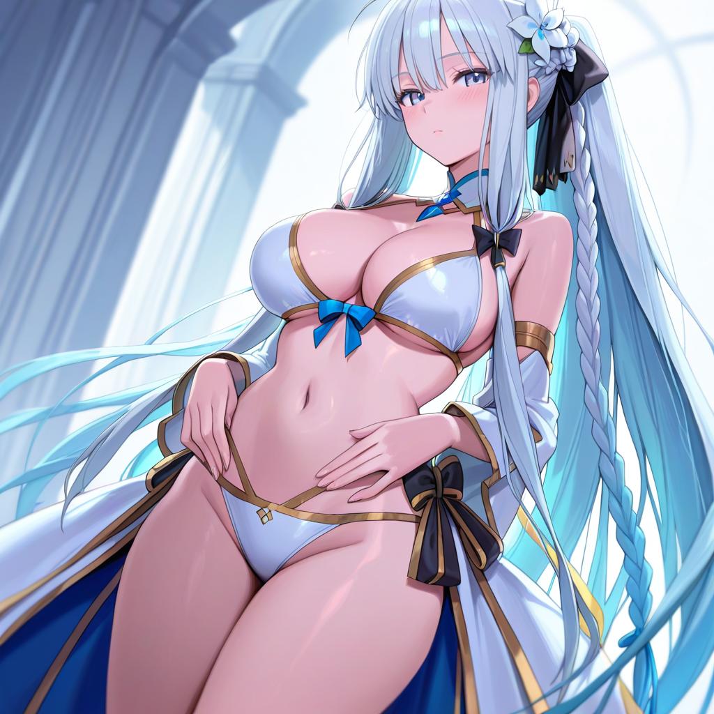 Morgan le fay (water princess) (fate), fate/grand order, 1girl, blue eyes, very long hair, white hair, grey hair, blue hair, ponytail, sidelocks, twin braids, french braid, hair flower, hair ribbon, large breasts, cleavage, thighs, navel, white bikini, bare shoulders, detached sleeves, puffy long sleeves, gold trim, by artist freng, illustrious