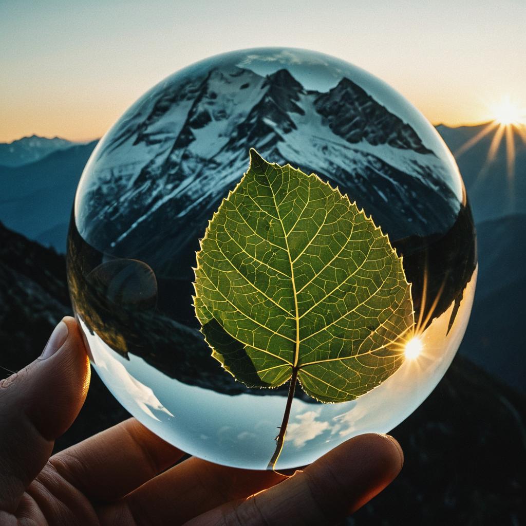 Highly detailed close-up of a leaf holding a delicate glass sphere, reflection of a mountain sunset within, fine textures, intricate light play.