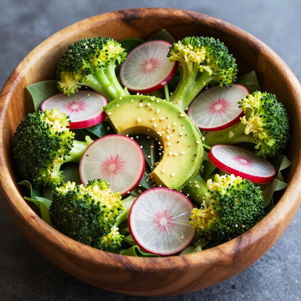 Photograph of a wooden bowl filled with vibrant green broccoli, pink radish slices, and sliced avocado, sprinkled with sesame seeds.