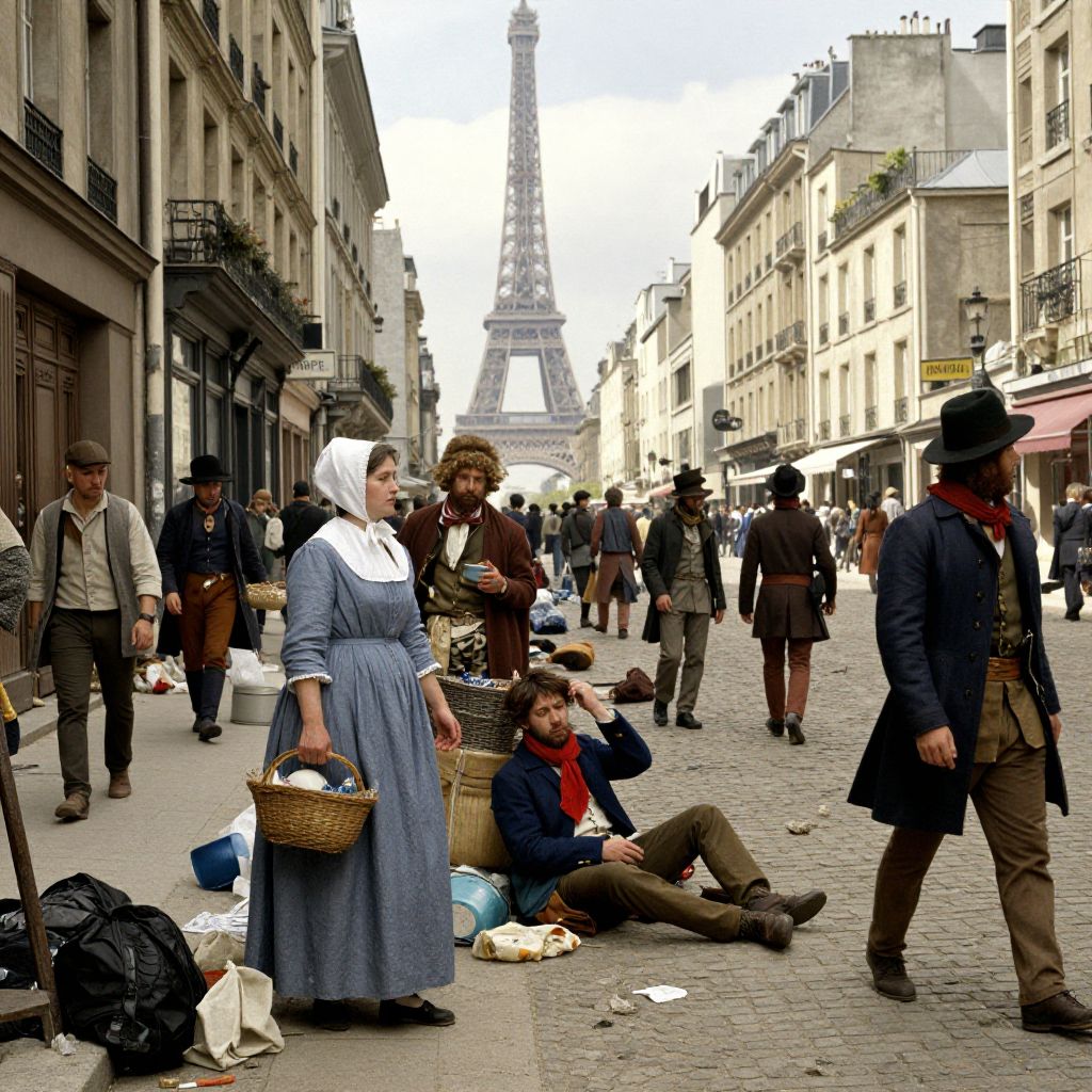 The image depicts a bustling street scene in Paris during the Napoleonic Empire, capturing the essence of the French population suffering from the consequences of the continental blockade. The scene is filled with a diverse array of people, dressed in period clothing, engaged in various activities. A woman in a white bonnet and blue dress stands prominently in the foreground, holding a basket, while a man in a blue coat and red scarf sits on the ground, possibly begging or resting. The street is lined with buildings, some with signs, including one that reads \"HARPE.\" The Eiffel Tower looms in the background, adding a sense of historical context and location. The cobblestone street is littered with various items, such as a bucket and a bag, indicating the poverty and struggle of the inhabitants. The overall composition is dynamic, with people moving in different directions, creating a sense of movement and chaos. The interplay of colors, textures, and shapes adds depth and realism to the scene, capturing the essence of daily life during this tumultuous period.