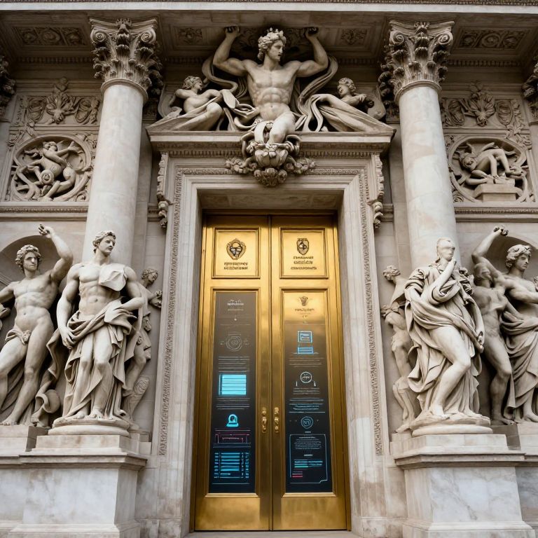 Photograph of an ornate, classical-style building entrance. The central focus is a pair of golden, double doors adorned with blue and black digital security panels, featuring logos and buttons. Above the doors, a detailed relief sculpture of a muscular, nude male figure with a laurel wreath, arms raised, surrounded by intricate carvings and floral motifs. Flanking the doors are two large, marble columns, each topped with elaborate capitals. On either side of the columns stand statues of draped, classical female figures holding objects, adding to the grandeur. The overall color palette is a mix of gray marble and gold accents, creating a striking contrast.