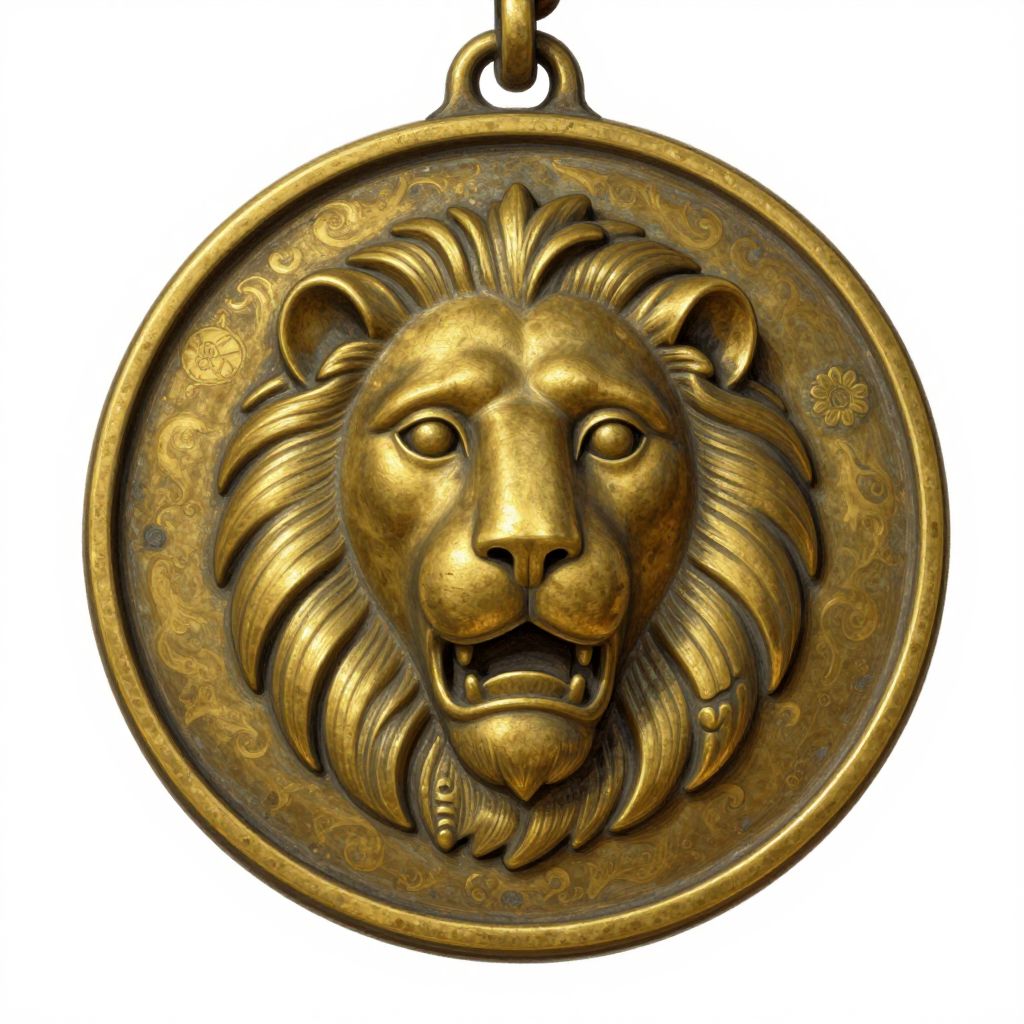 Golden, circular, ornate pendant featuring a detailed, roaring lion's head with intricate mane patterns and floral motifs, hanging by a small loop.
