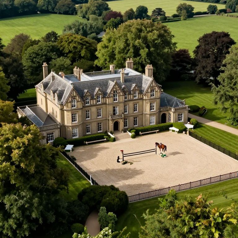 Aerial photograph of a grand, beige, Victorian-style mansion with multiple chimneys, gabled roofs, and tall windows. The mansion is surrounded by lush green trees and expansive lawns. In the foreground, a light beige, rectangular equestrian arena with a wooden fence is visible, featuring a horse and rider. White umbrellas are positioned along the perimeter of the arena. The background showcases rolling green fields under a clear sky. The image has a vivid, high-contrast style, highlighting the mansion's intricate architecture and the lush, vibrant landscape.