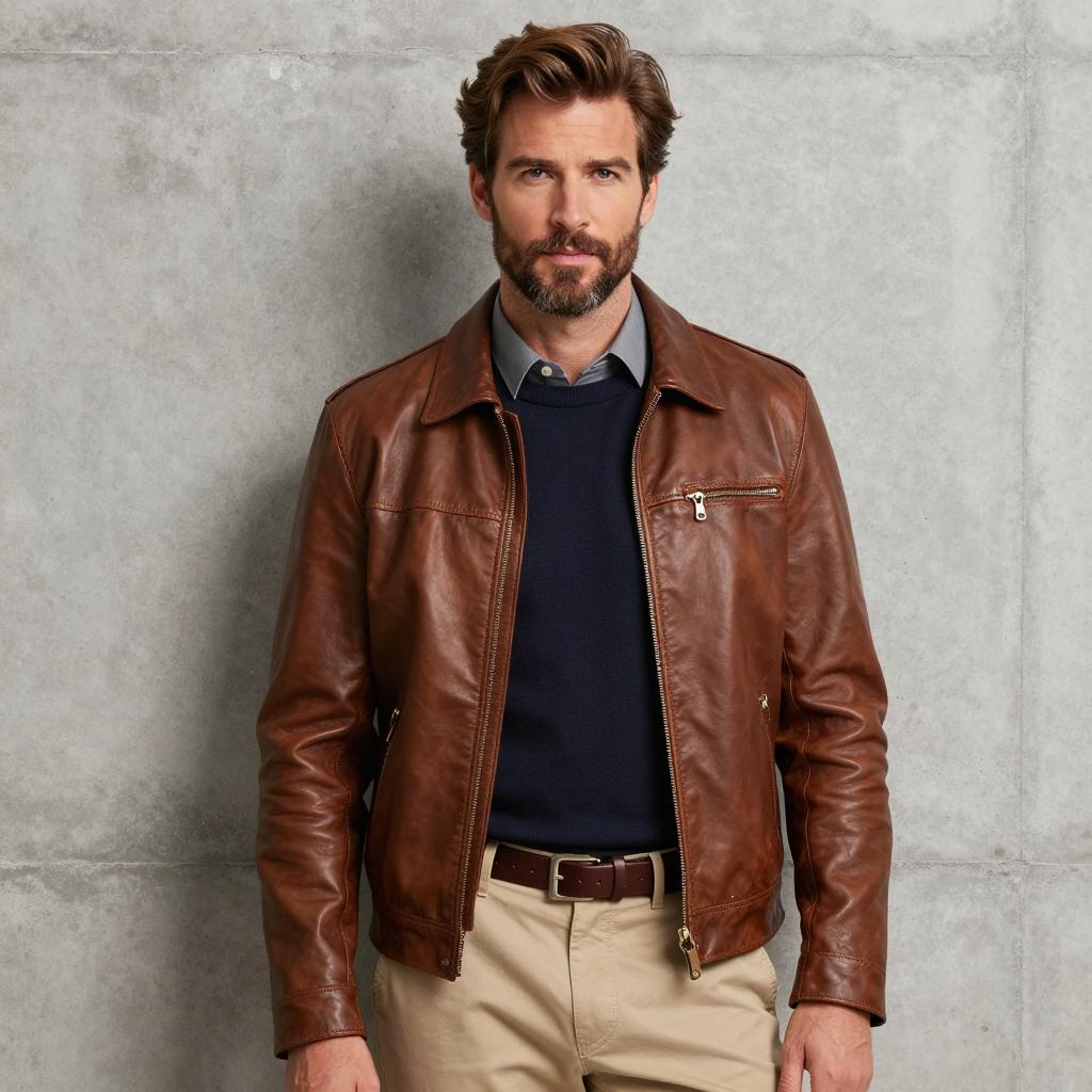 Man designer jeans costume, photograph of a handsome white man, blue denim shirt with pockets, blue jeans, brown belt with large buckle, hands in pockets, short brown hair, light beard, neutral gray background, studio lighting, serious expression, standing, casual outfit, realistic style