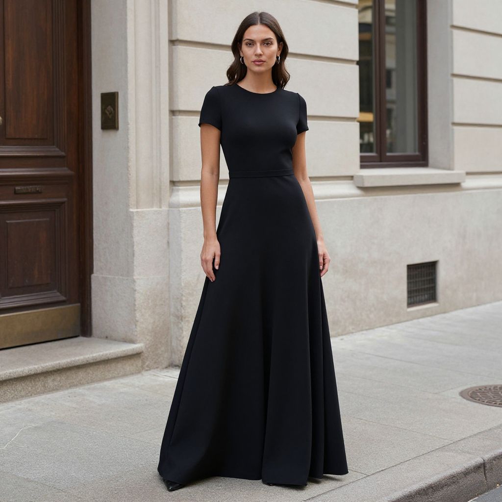Short Sleeve Formal Gown Costume, a woman in a black dress standing on a sidewalk
