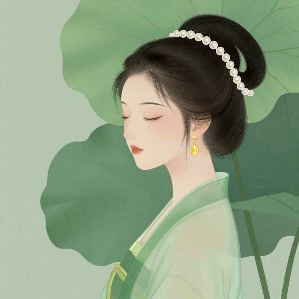 Digital illustration of an East Asian woman in profile facing left with closed eyes and a calm expression. She has pale skin and black hair styled in a bun adorned with a string of pearls. She wears a sheer green dress with traditional elements and gold drop earrings. The background features overlapping large green leaves with soft green lighting, adding a tranquil atmosphere.