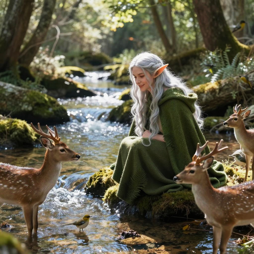 Female wood elf art, serene scene by a crystal-clear forest stream, flowing silver hair cascading over natural green cloak, gentle smile, surrounded by delicate woodland creatures like deer and songbirds, beams of sunlight illuminating sparkling water, harmonious connection with nature.