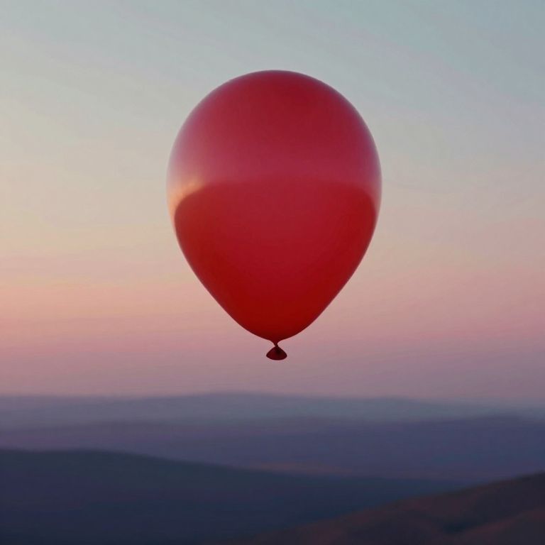 Visualize an enigmatic landscape reminiscent of surrealist art, where a life-like red balloon hovers in mid-air, concealing an intriguing figure or object beneath its deceptive surface. This captivating scene is viewed from an unconventional 'bug's-eye perspective', inviting the viewer to explore the hidden layers and reveal what lies beneath the ordinary facade. The background showcases a dreamlike gradient transitioning from soft pastel tones up close to deep, rich hues in the distance, enhancing the fantastical aura of this surreal world. Crafted with meticulous attention to detail and texture, this image balances hyperrealistic elements with abstract mysteries, creating an atmosphere of intrigue and enchantment that entices the audience to delve deeper into its secrets.