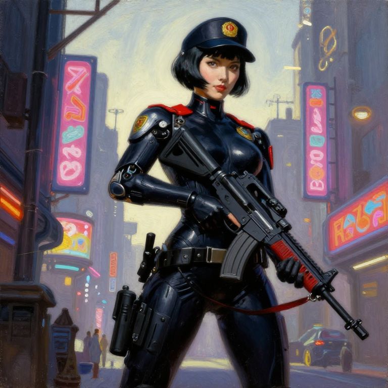 Detailed renaissance oil painting, an oriental female cyberpunk space Warrior in red power armor with bright yellow embellishments, long blonde flowing hair, bangs, earrings, dark eyeshadow, red lips, holding a sniper rifle, aiming, dynamic pose, in a battle on a futuristic city street, smoke hanging in the air, ruins and smoking damaged buildings, directional lighting, cowboy shot