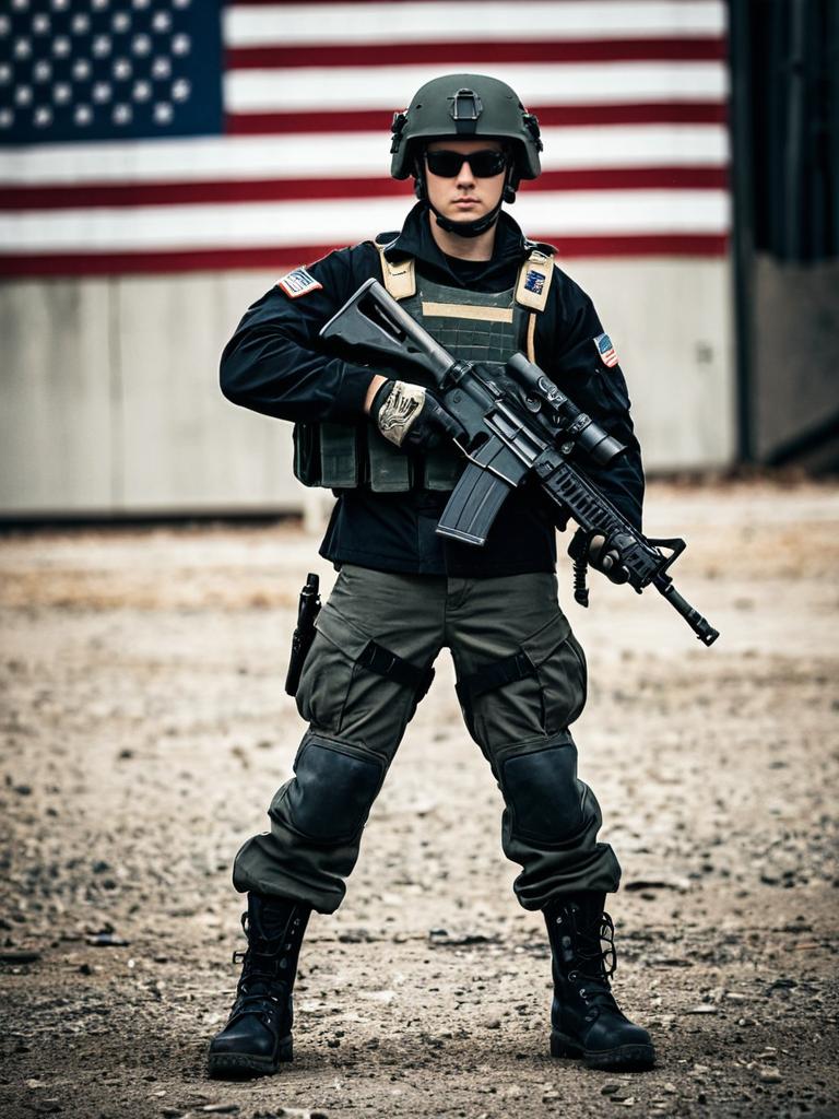 Boots, weapon, gun, helmet, gloves, solo, holding, 1boy, pants, jacket, holding weapon, male focus, standing, full body, sunglasses, holding gun, long sleeves, combat helmet, military, blurry background, american flag, uniform, military uniform, combat boots, blurry