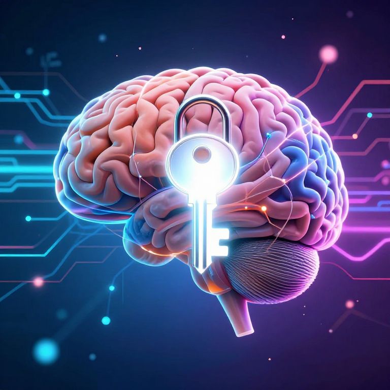 Conditioning concept illustrated as a brain unlocking a glowing key, surrounded by neural networks and digital circuits, vibrant colors, surreal and abstract style, symbolizing mental and physical training